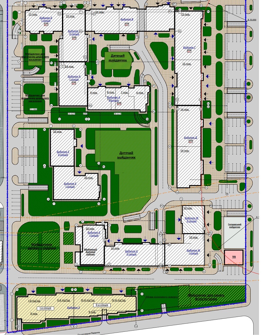 На ділянці наші фахівці запроектували дев’ять будинків різної поверховості із незалежною інженерною інфраструктурою. У частині житлових будинків для мешканців кварталу передбачено вбудовані нежитлові приміщення (торгові, офісні), а під будинками – підземний паркінг з окремими виїздами та виходами. Захід у будинки буде зі сторони внутрішнього двору та по периметру, а в громадські приміщення – зі сторони зовнішнього периметра комплексу.